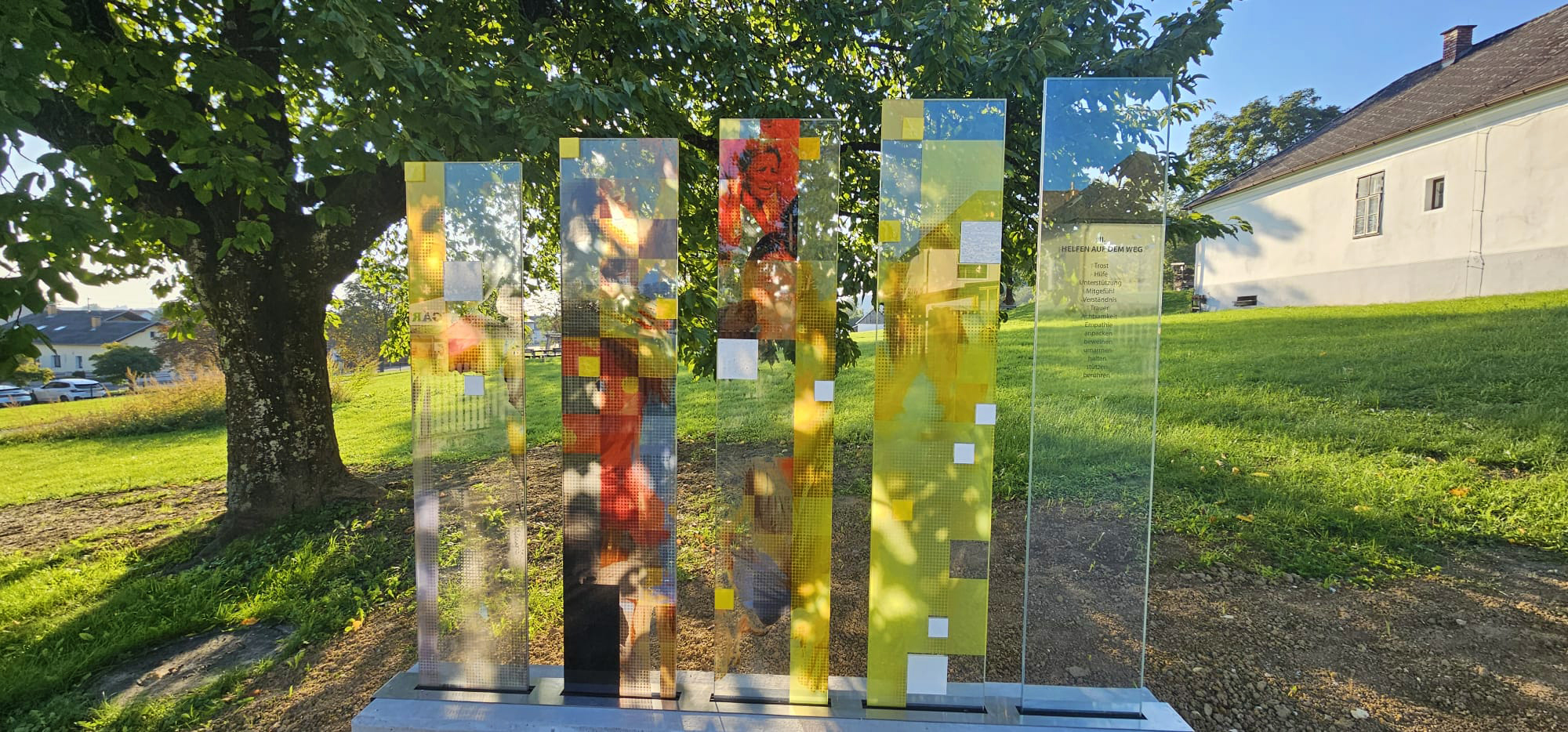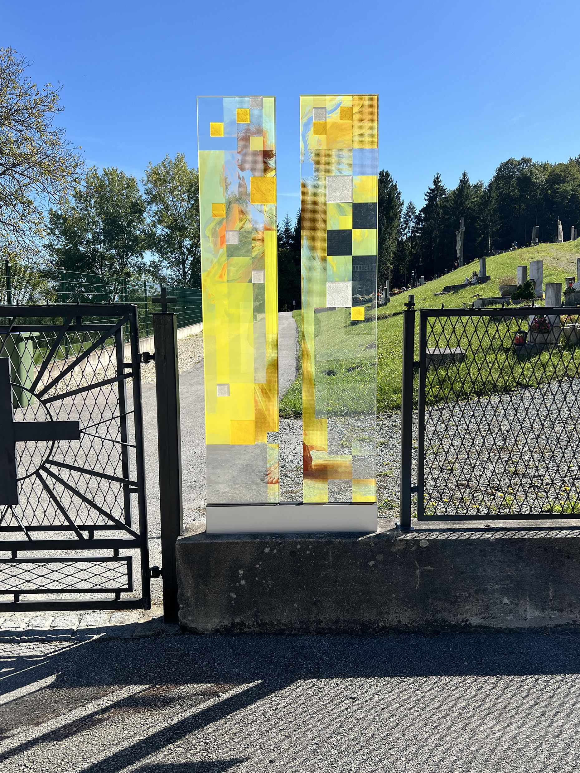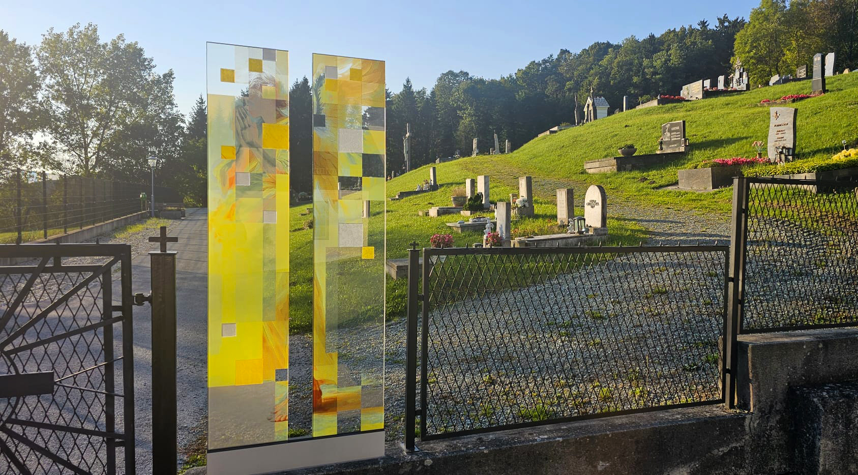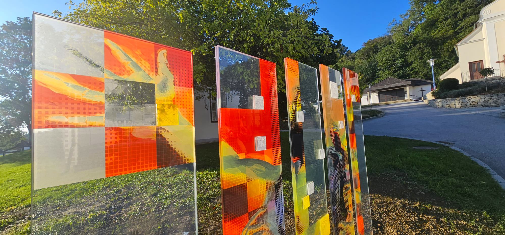 Orientiert am gegenüberliegenden Lattenzaun – ein traditionell burgenländisches Architekturdetail – gestaltet Heinz Ebner die Bilder jeder einzelnen Station in unterschiedlich farbig gestalteten Glasstelen. Der Weg führt von GEFANGEN – GEFALLEN, HELFEN AUF DEM WEG, BLOSSGESTELLT – FESTGENAGELT, TOD – VERLUST, TROST IN DER BEGEGNUNG, EUCHARISTIE – GEMEINSAM AUF DEM WEG bis hin zu HIMMELFAHRT – CHRISTUS GEHT VORAN im Friedhofsmarterl.