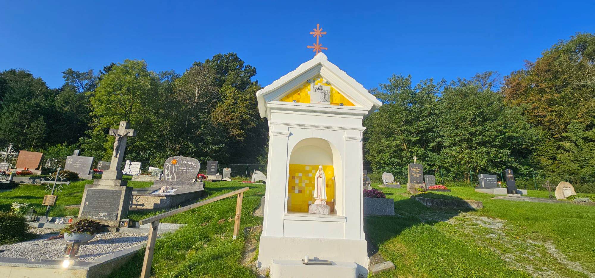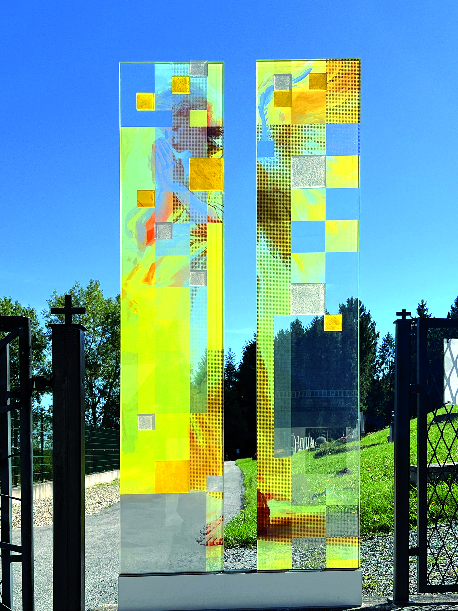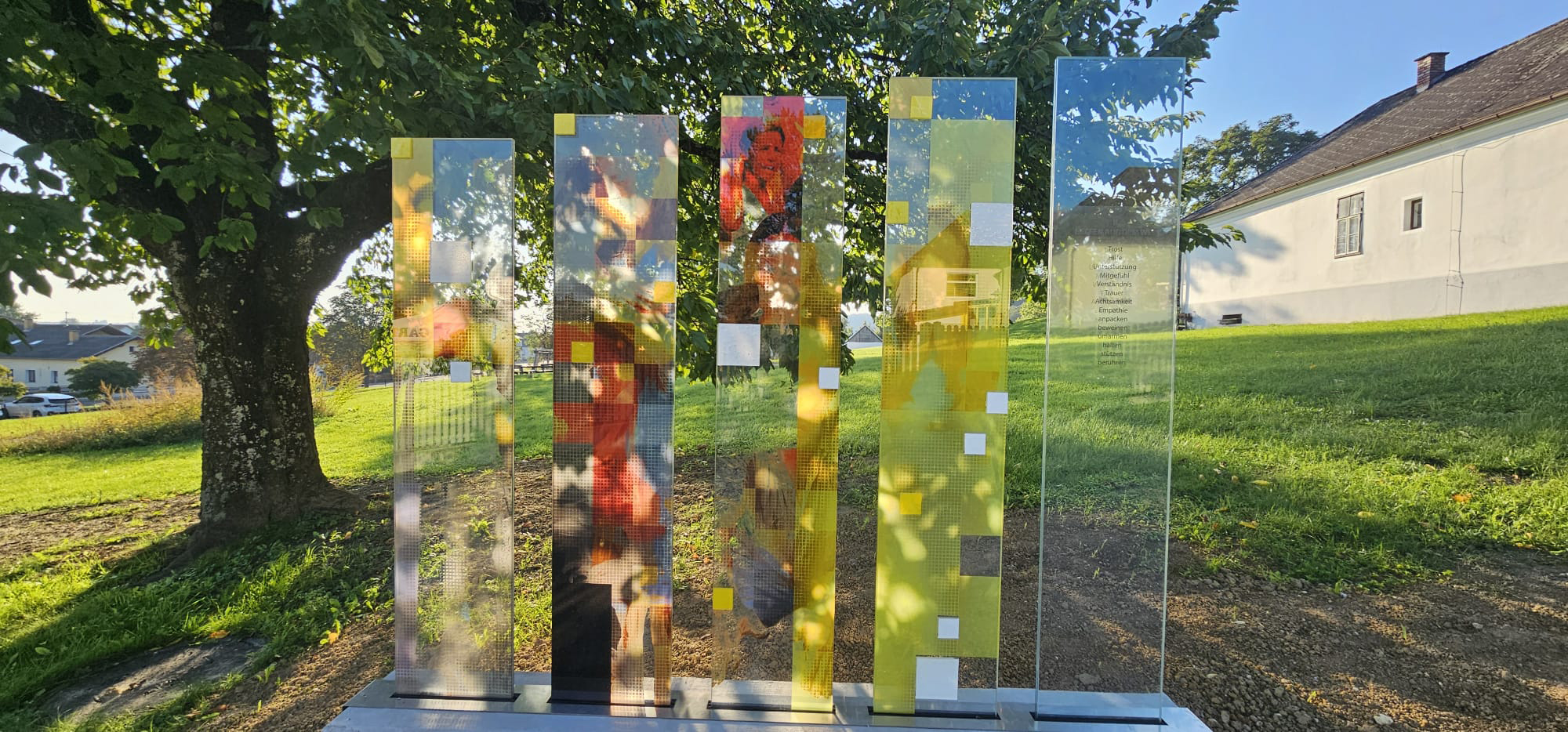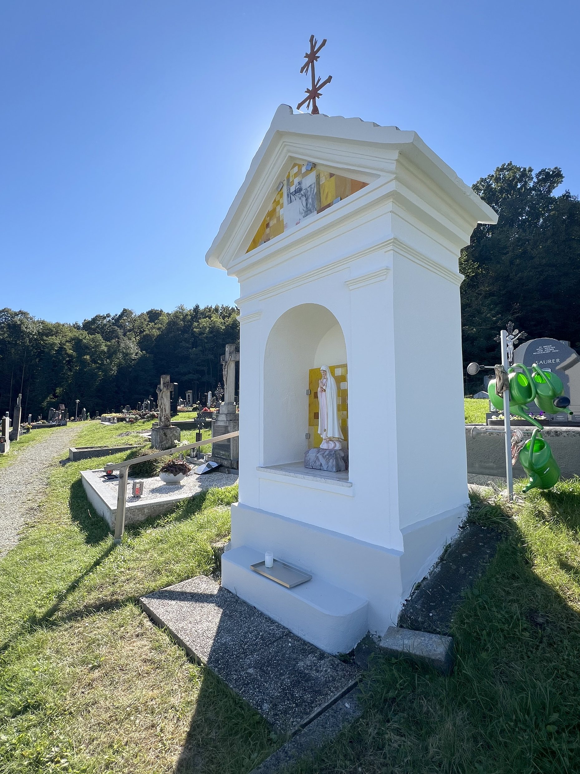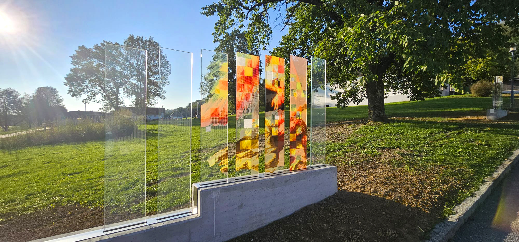 Orientiert am gegenüberliegenden Lattenzaun – ein traditionell burgenländisches Architekturdetail – gestaltet Heinz Ebner die Bilder jeder einzelnen Station in unterschiedlich farbig gestalteten Glasstelen. Der Weg führt von GEFANGEN – GEFALLEN, HELFEN AUF DEM WEG, BLOSSGESTELLT – FESTGENAGELT, TOD – VERLUST, TROST IN DER BEGEGNUNG, EUCHARISTIE – GEMEINSAM AUF DEM WEG bis hin zu HIMMELFAHRT – CHRISTUS GEHT VORAN im Friedhofsmarterl.