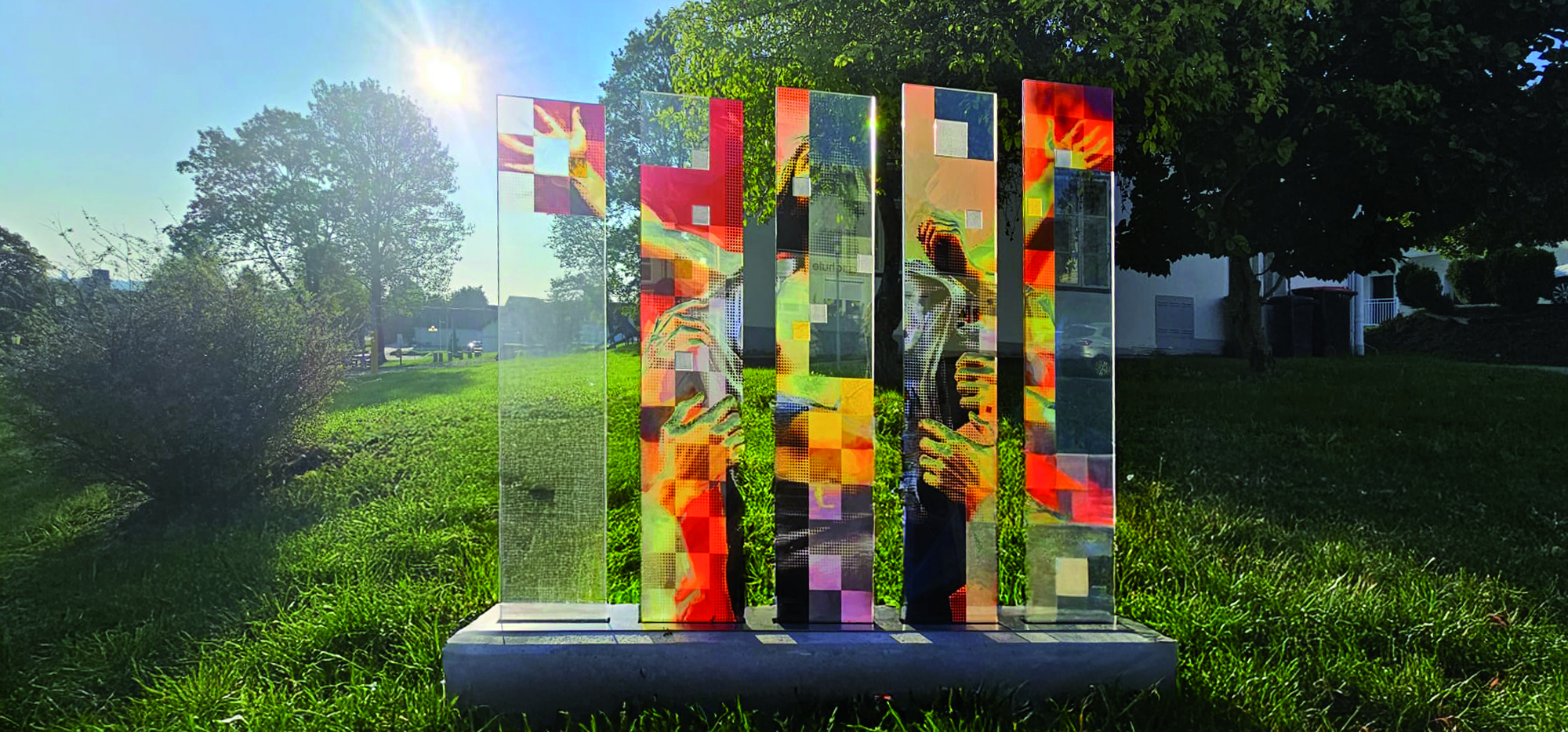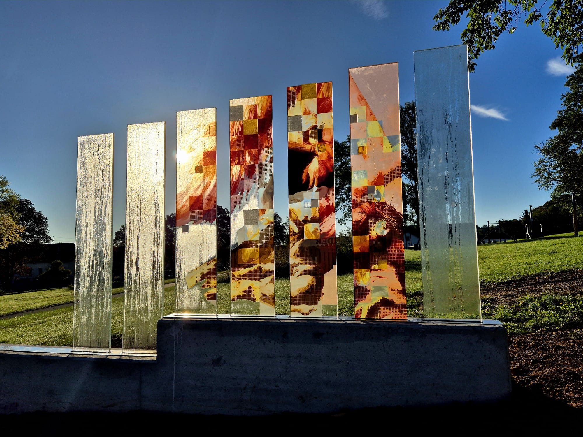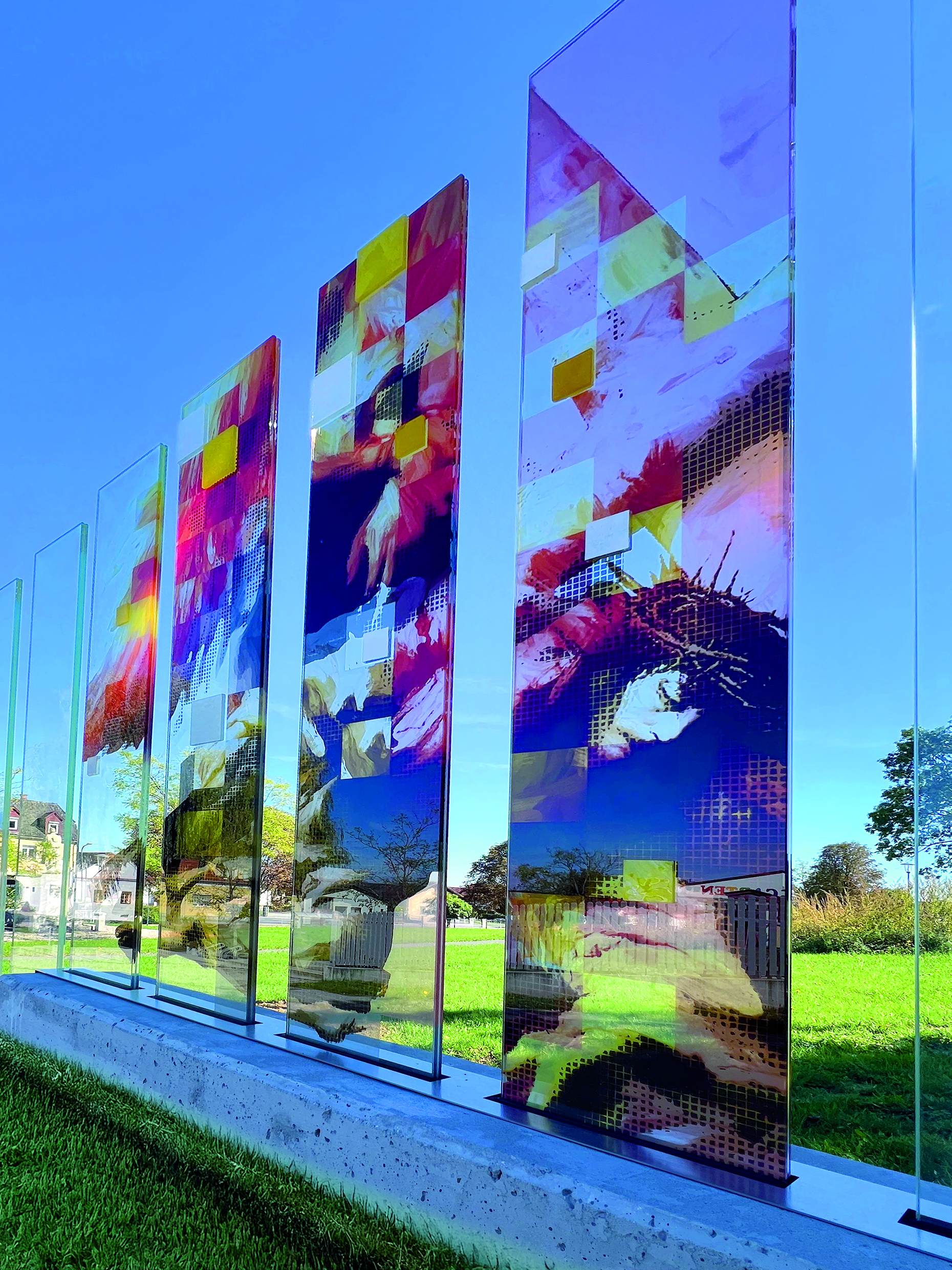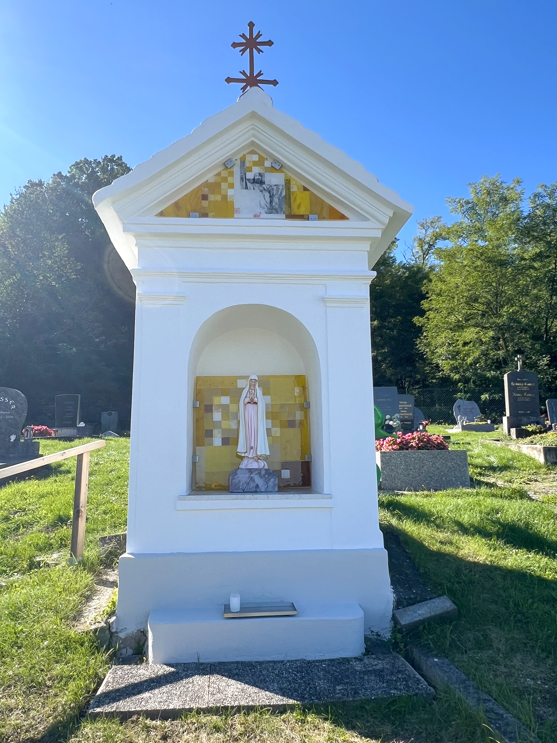 Orientiert am gegenüberliegenden Lattenzaun – ein traditionell burgenländisches Architekturdetail – gestaltet Heinz Ebner die Bilder jeder einzelnen Station in unterschiedlich farbig gestalteten Glasstelen. Der Weg führt von GEFANGEN – GEFALLEN, HELFEN AUF DEM WEG, BLOSSGESTELLT – FESTGENAGELT, TOD – VERLUST, TROST IN DER BEGEGNUNG, EUCHARISTIE – GEMEINSAM AUF DEM WEG bis hin zu HIMMELFAHRT – CHRISTUS GEHT VORAN im Friedhofsmarterl.