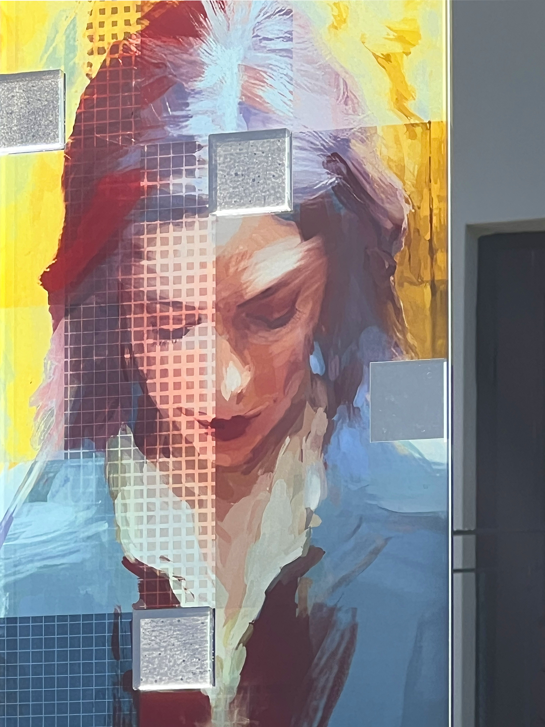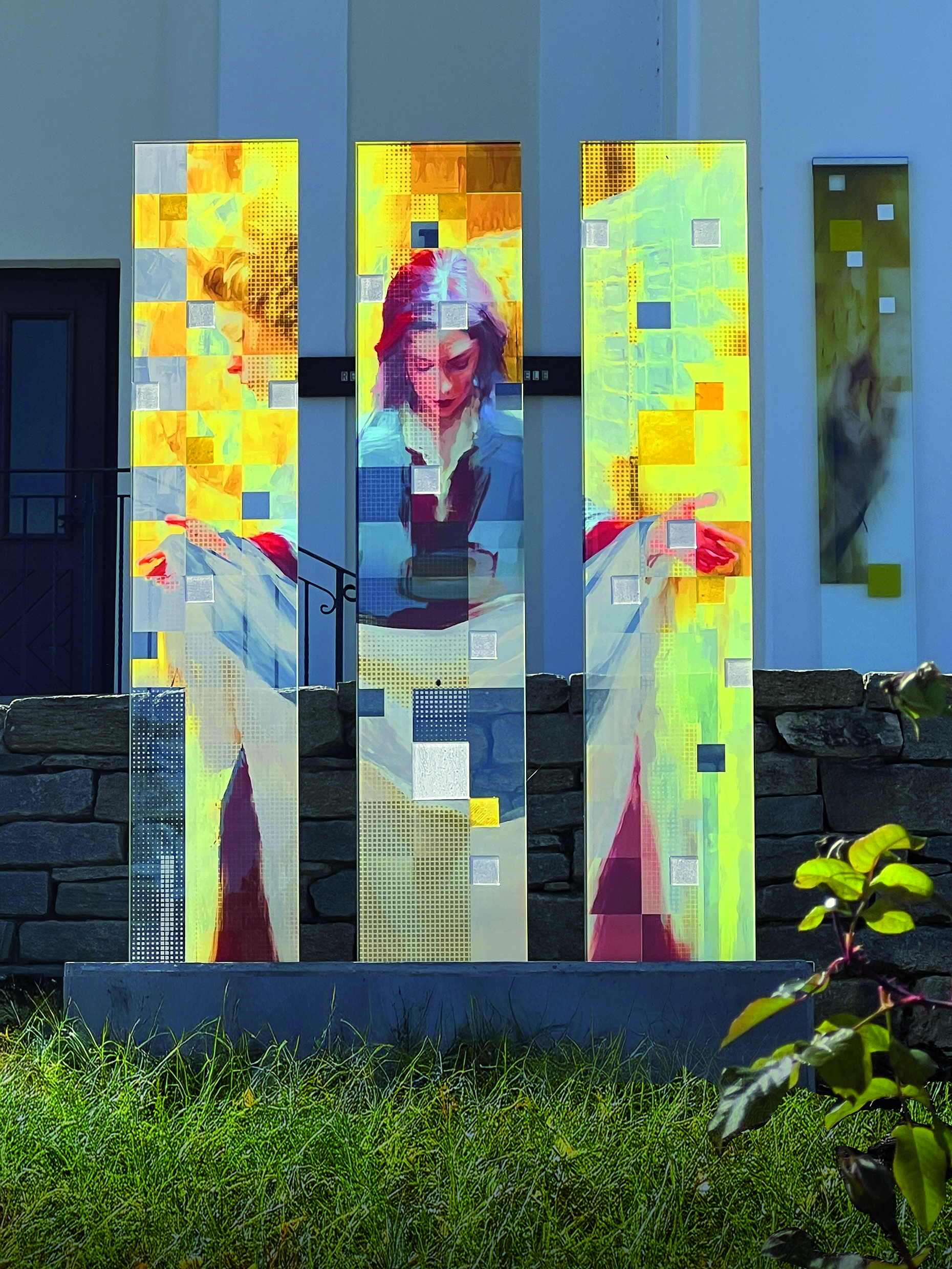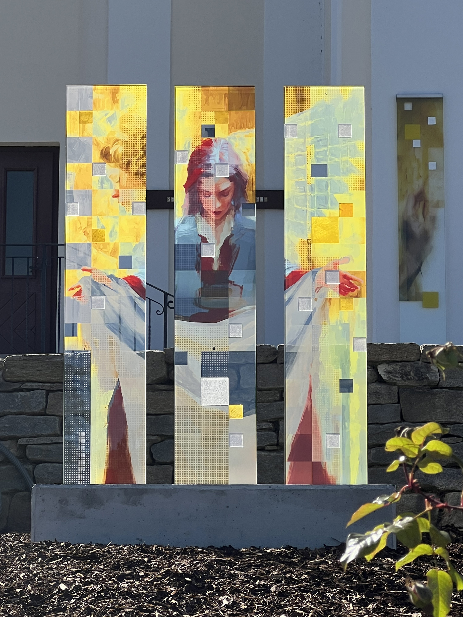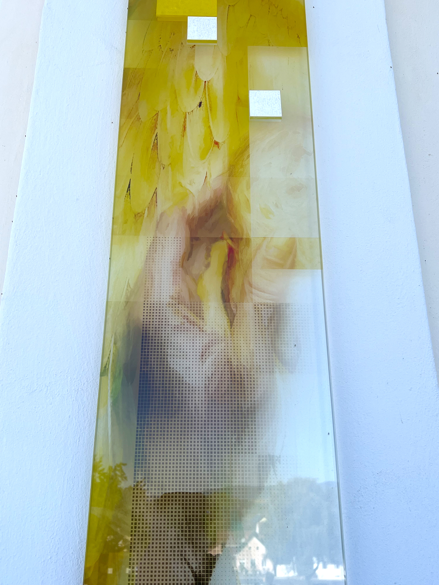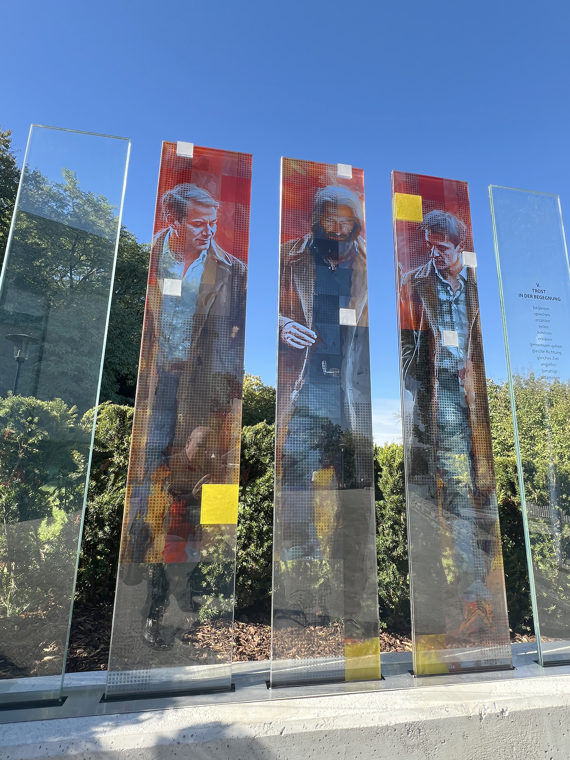 Orientiert am gegenüberliegenden Lattenzaun – ein traditionell burgenländisches Architekturdetail – gestaltet Heinz Ebner die Bilder jeder einzelnen Station in unterschiedlich farbig gestalteten Glasstelen. Der Weg führt von GEFANGEN – GEFALLEN, HELFEN AUF DEM WEG, BLOSSGESTELLT – FESTGENAGELT, TOD – VERLUST, TROST IN DER BEGEGNUNG, EUCHARISTIE – GEMEINSAM AUF DEM WEG bis hin zu HIMMELFAHRT – CHRISTUS GEHT VORAN im Friedhofsmarterl.