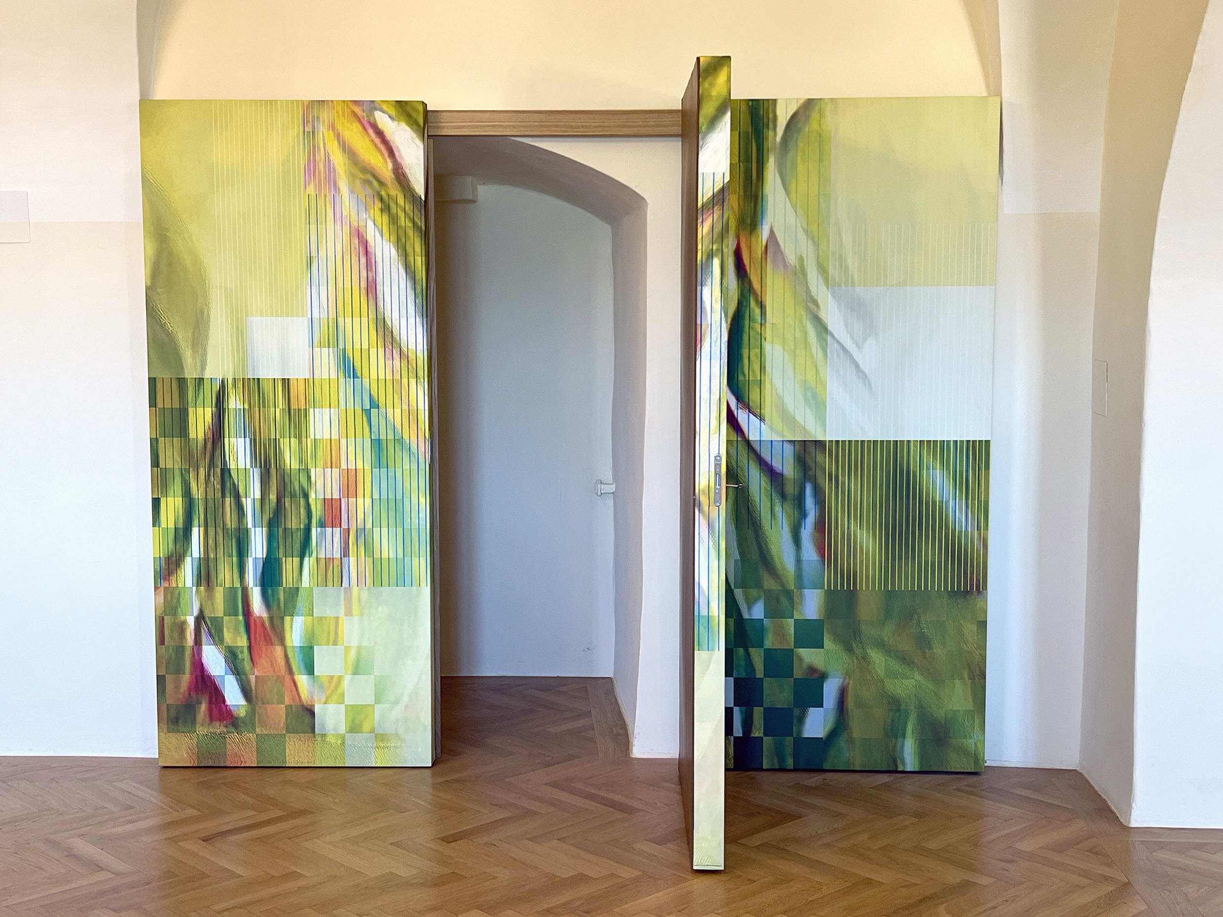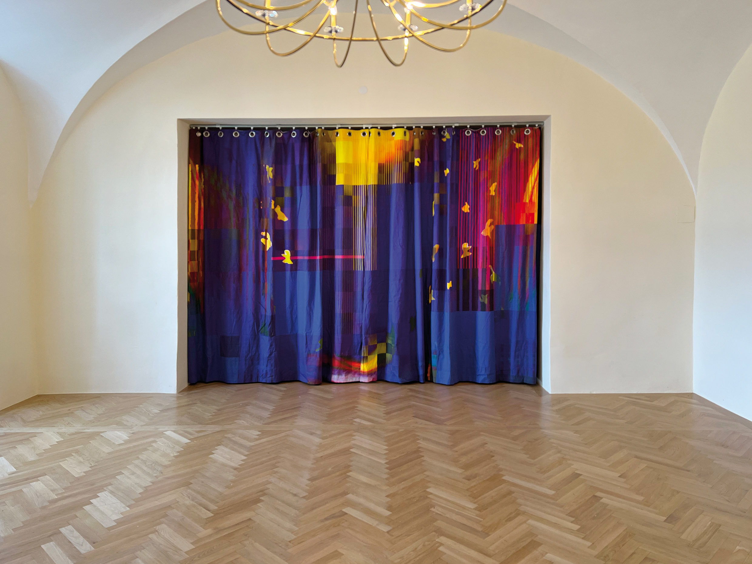Die Bilder im neuen Klostersaal erfüllen einerseits die Aufgabe, den neurenovierten Saal optisch-künstlerisch aufzuwerten und andererseits fungieren die Bild-Objekte auch als Akkustik-Absorber. Grundlage für die Gestaltung ist ein Bild, welches an der Hauptwand des Saales 1976 anlässlich eines Malwettbewerbes für die Güssinger Schulen ausgestellt war – es war das Bild „Sonnengesang“ von Johann Traupmann, dem Sieger des Wettbewerbes. Dieses Thema erinnert auch an das Jubläumsjahr 2025 anlässlich „800 Jahre Sonnengesang des Franz von Assisi“. Heinz Ebner interpretiert das originale Hochformatbild von Johann Traupmann neu und gestaltet mit diesen Motiven das Tryptichon an der Hauptwand, Das Garderoben-Bild und die Nischentür an der Seitenwand so wie den neuen Bühnenvorhang.